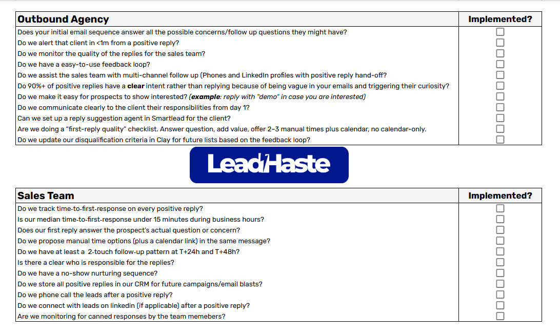 Two player audit for agencies and sales teams to convert positive replies into revenue using SLAs, scripts, follow ups, scorecards.